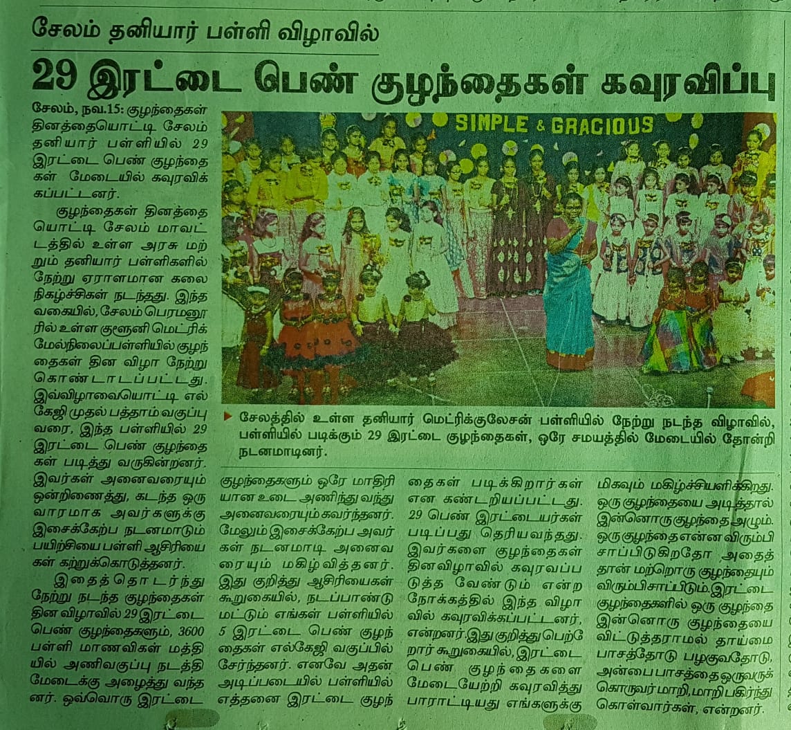 Children’s Day was celebrated at Cluny Matriculation Higher Secondary School on 14th November 2019, to mark Pandit Jawaharlal Nehru’s birth Anniversary with enthusiasm. Mrs. L. Sumathi – The District Educational Officer, Salem was the Chief Guest who presided over the function and addressed the gathering with a profound message. Our Correspondent Rev. Sr. Anita, Our Principal Rev. Sr. Roselyn and all the teachers wished all the children a very Happy Children’s Day. The Programme began with prayer conducted by the teachers of Cluny. The Staff entertained the students with various programmes which were absolutely mind blowing and the students were left spell bound. On this joyous occasion our Principal Rev. Sr. Roselyn honoured all the Twins of our school who were 29 in pairs which added a feast to the show and was celebrated in the name of “Double Dhamaka” and made this day the most remarkable and memorable for the students. To make the day more enjoyable various competitions were conducted and the students were given prizes.