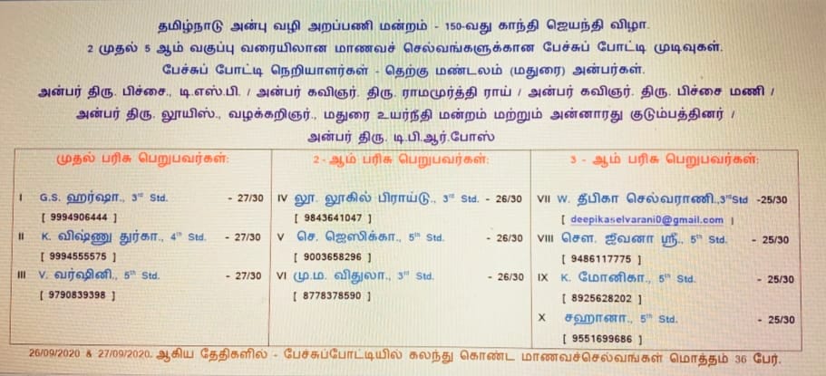 On behalf of 150th Birth Anniversary of Mahatma Gandhi, Tamilnadu Anbu Valli Arapani Mandram organized various competitions like Drawing, Essay, Elocution through online on 02.10.2020. Our student G.S. Harsha participated in Tamil Elocution and won 1st prize under class 2 to 5 Category.