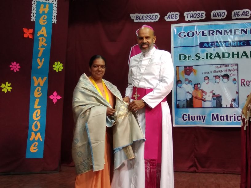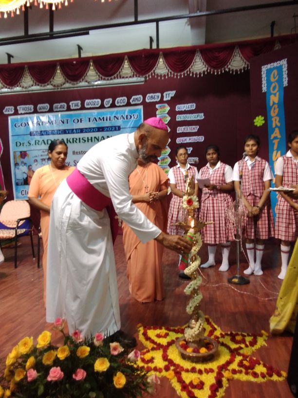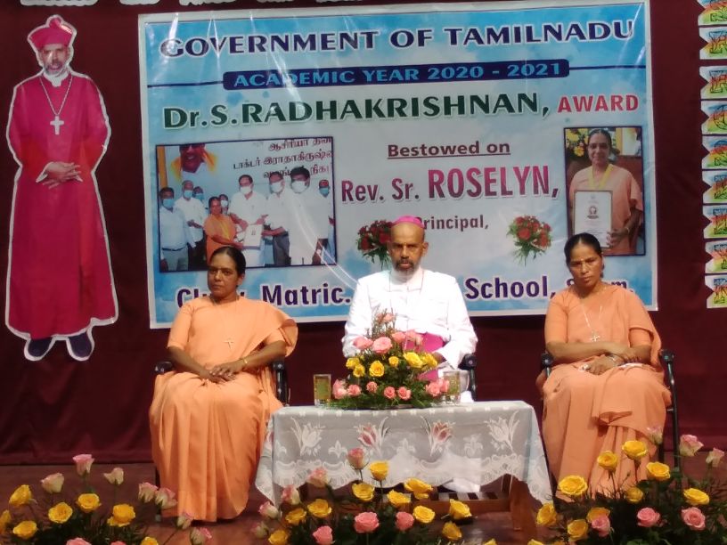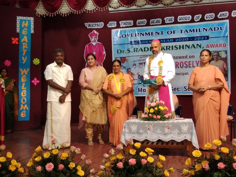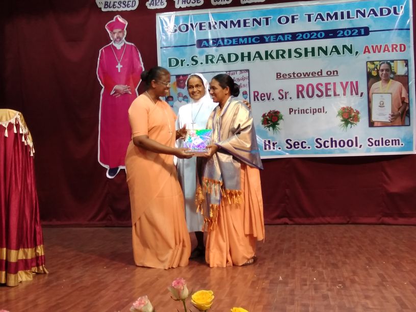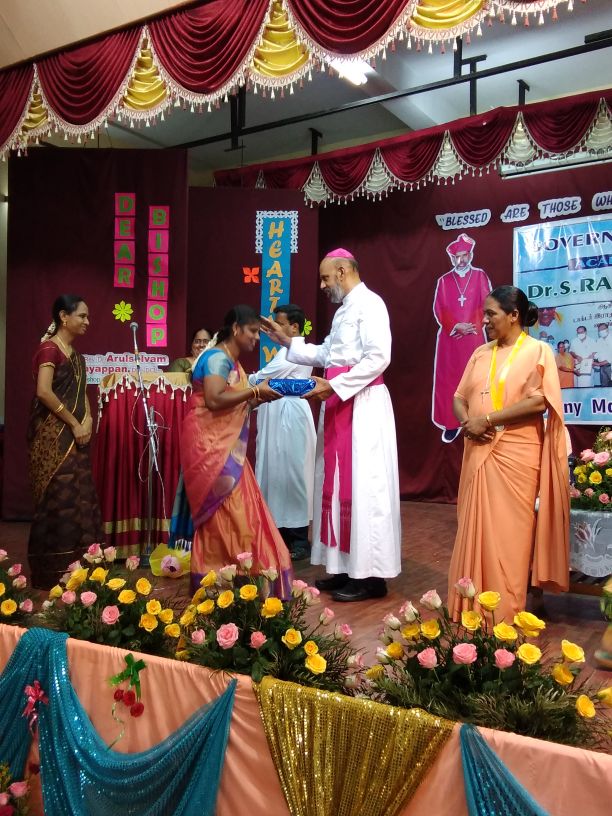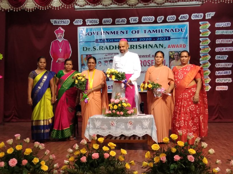 The 22nd of September 2021 was a momentous occasion as Rt. Rev. Dr. Arulselvam Rayyapan, Bishop of Salem, presided over the Felicitation function of Principal Rev. Sr. Roselyn on being bestowed with the DR RADHAKRISHNAN AWARD by the Government of Tamil Nadu. The Bishop also honoured the awardee on behalf of the congregation and the Diocese. The programme was well attended by Rev. Fathers, Rev. Sisters, Principal's of other institutions, PTA , COSA members, well wishers, teachers and students of the institution. The formal function of draping the Ponnadai and giving away the mementos was followed by felicitation and an entertainment programme. The Bishop also felicitated Rev. Sr. Roselyn and wished her for the good work done. The programme ended on a happy note with a vote of thanks from the principal.