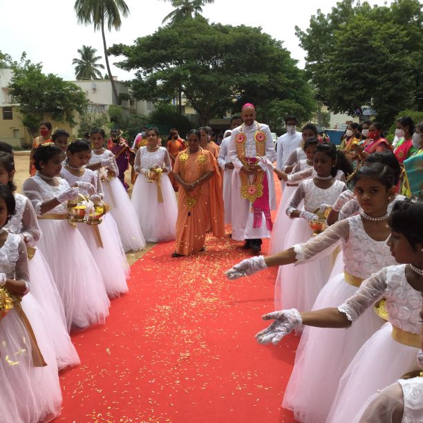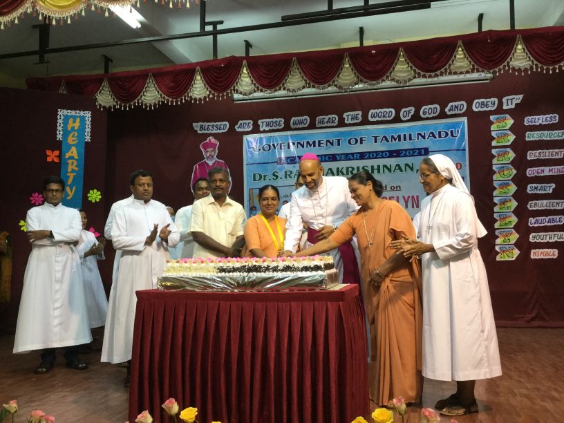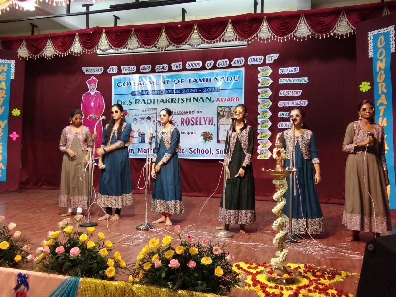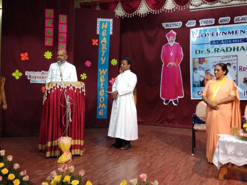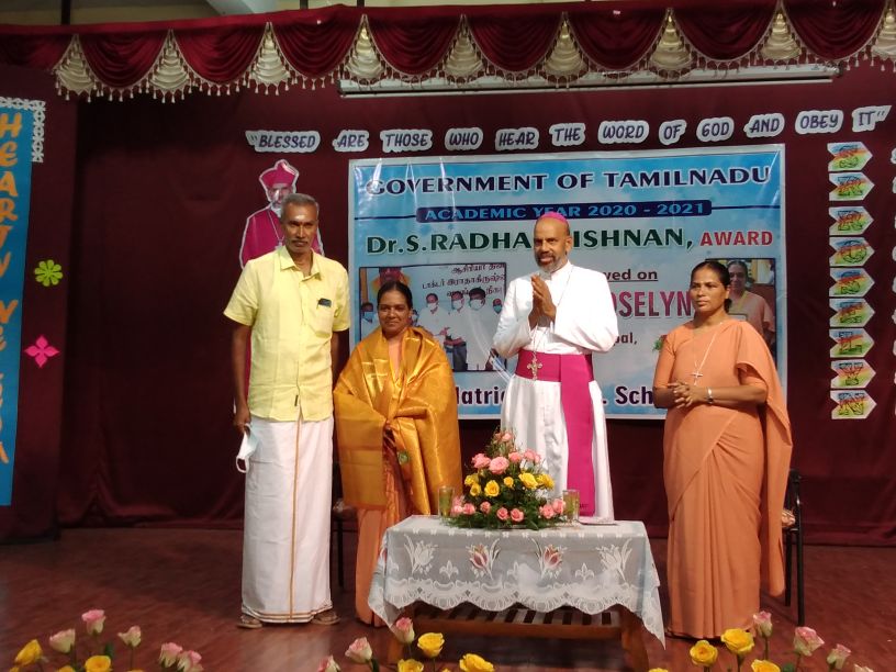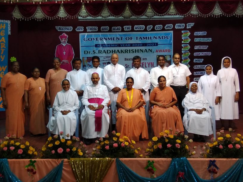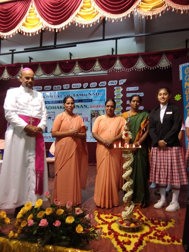 The 22nd of September 2021 was a momentous occasion as Rt. Rev. Dr. Arulselvam Rayyapan, Bishop of Salem, presided over the Felicitation function of Principal Rev. Sr. Roselyn on being bestowed with the DR RADHAKRISHNAN AWARD by the Government of Tamil Nadu. The Bishop also honoured the awardee on behalf of the congregation and the Diocese. The programme was well attended by Rev. Fathers, Rev. Sisters, Principal's of other institutions, PTA , COSA members, well wishers, teachers and students of the institution. The formal function of draping the Ponnadai and giving away the mementos was followed by felicitation and an entertainment programme. The Bishop also felicitated Rev. Sr. Roselyn and wished her for the good work done. The programme ended on a happy note with a vote of thanks from the principal.
