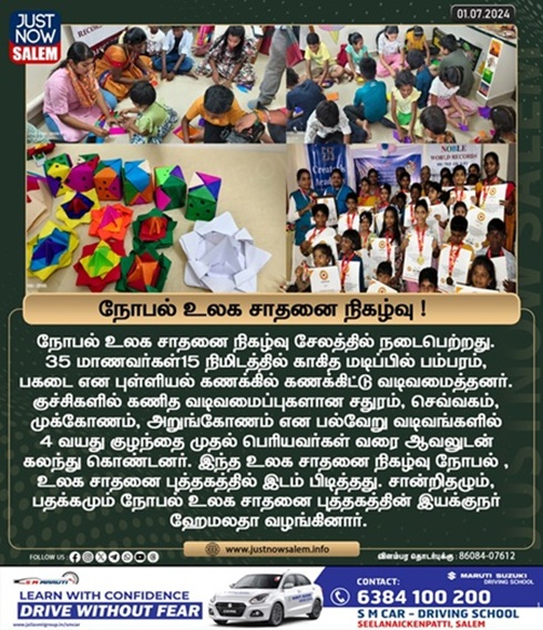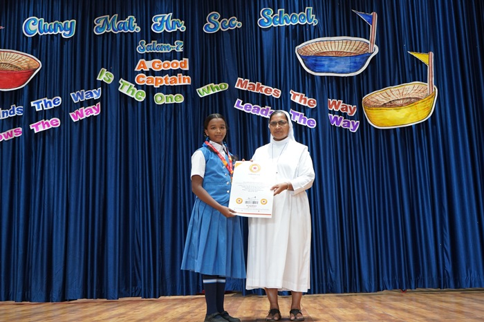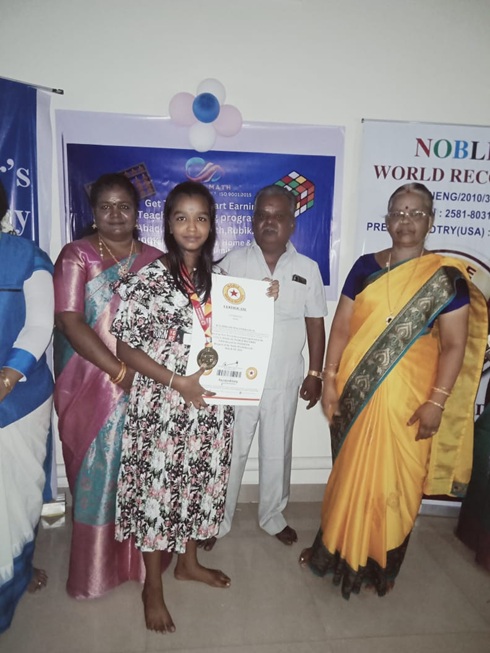 A World record event on the topic “Kagidhamum Kanidhamum” was organized by Creative Academy, 4 Roads, Salem on 30.06.2024 to create a awareness among students to implement the importance of calculation on Statistic Day. 35 students from different schools performed paper foldings for 20 minutes and Pranitha S P of Class VI from our school created a new world Record and received a certificate and a medal and the same is registered in the Noble Book of World Record.