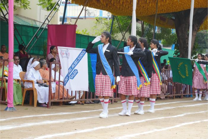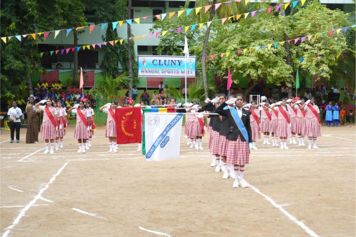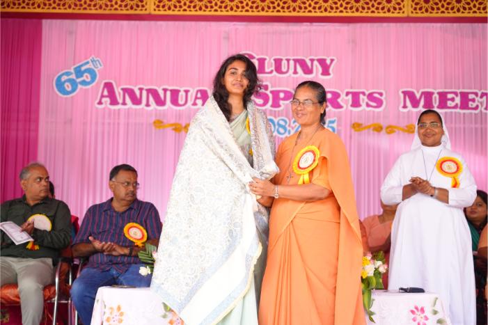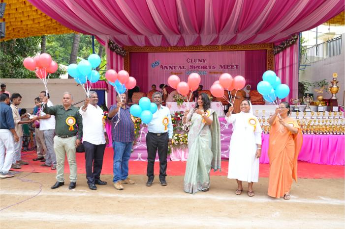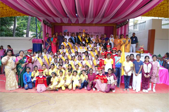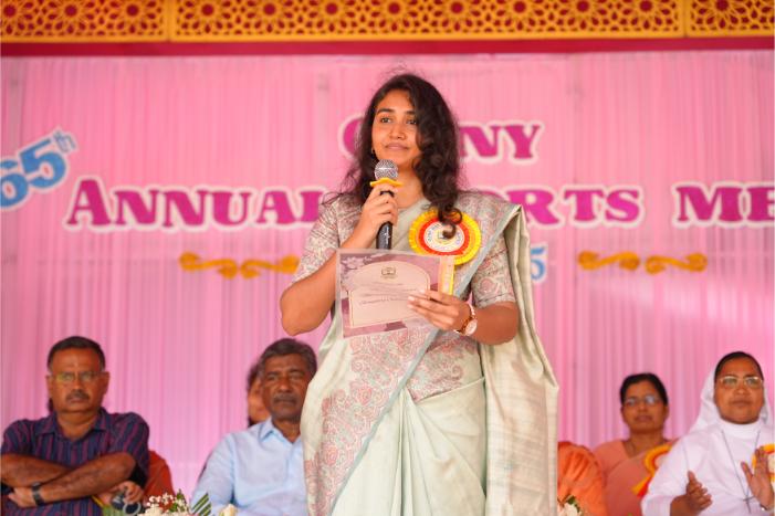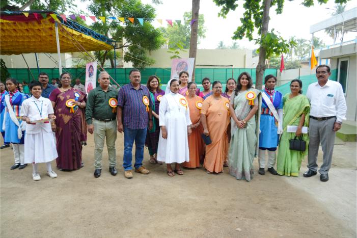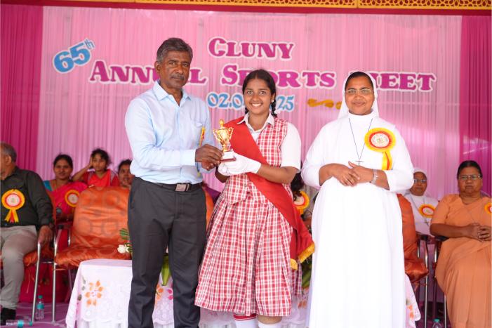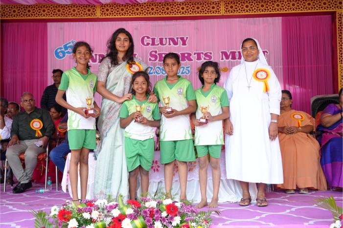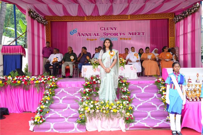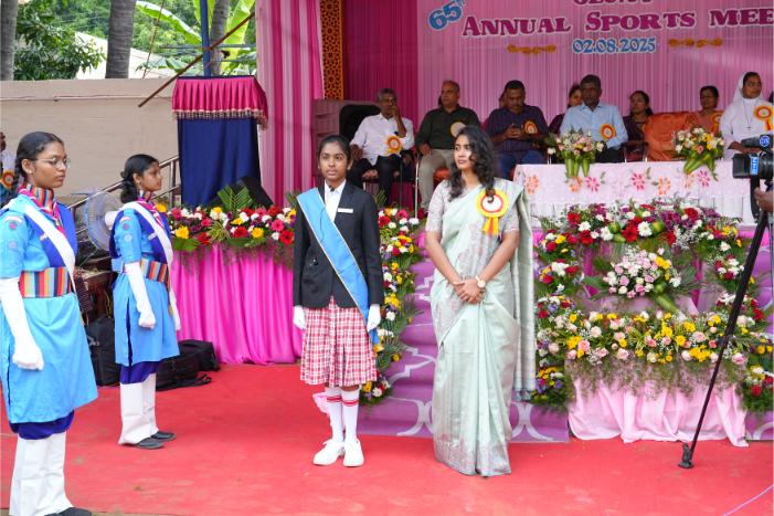 The much-awaited 65th Annual Sports Day 2025 was celebrated with great enthusiasm, energy, and team spirit on 02.08.2025. The Chief Guest of the day was Ms. Swaathi Ratna S, IPOS, Senior Superintendent of Post offices, Department of Posts, Ministry of Communications, Govt of India. The Guest of Honour was Mr. Rajaram N, M. A., NIS., Asst. Director(Rtd), Sports Authority of India, Principals, Sisters, Brothers & Staffs of various institutions, PTA & COSA members were present on this occasion. From the energetic opening march-past and oath-taking ceremony to the thrilling track and field events, the day was packed with excitement. Participants gave their best in every event, showcasing determination, discipline, and teamwork.