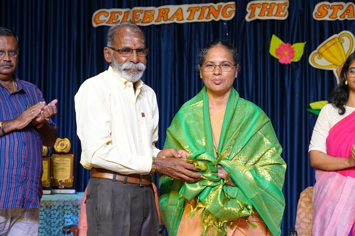 The Principal welcomed the gathering and commended the relentless efforts and dedication of the students, teachers, and parents. The highlight of the event was the distribution of prizes to the academic toppers. Students who secured the highest marks in the school were awarded trophies . Subject toppers were also felicitated. The event not only celebrated academic brilliance but also served as a motivation for other students to strive for excellence. Mr. Sekar, Sponsored Shield to the School toppers of Std XII and Std X for their marvellous achievement in the public exam. The atmosphere was filled with joy, pride, and inspiration as the achievers were applauded by their peers and teachers. The ceremony concluded with a vote of thanks.