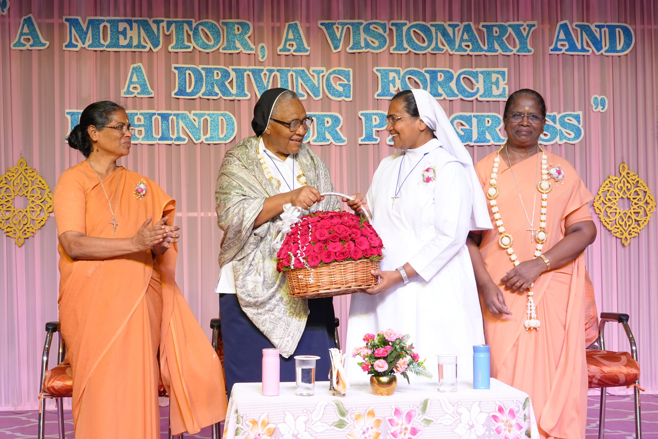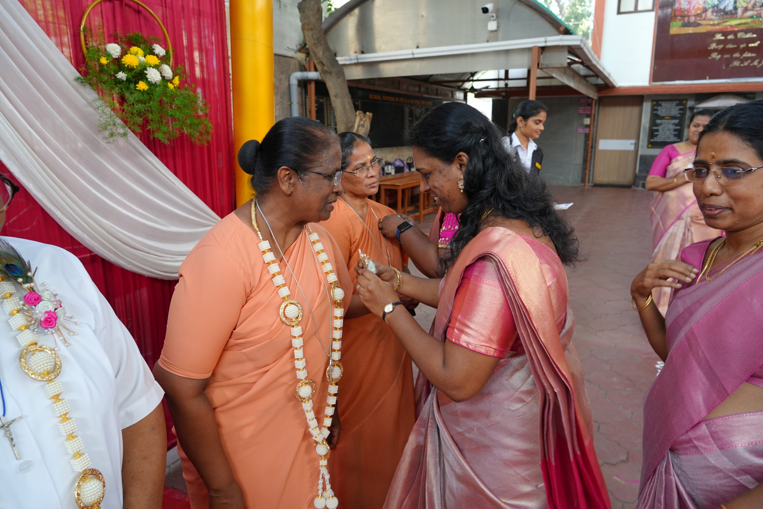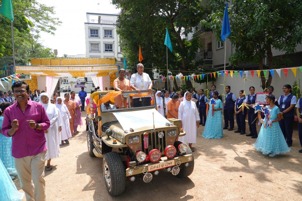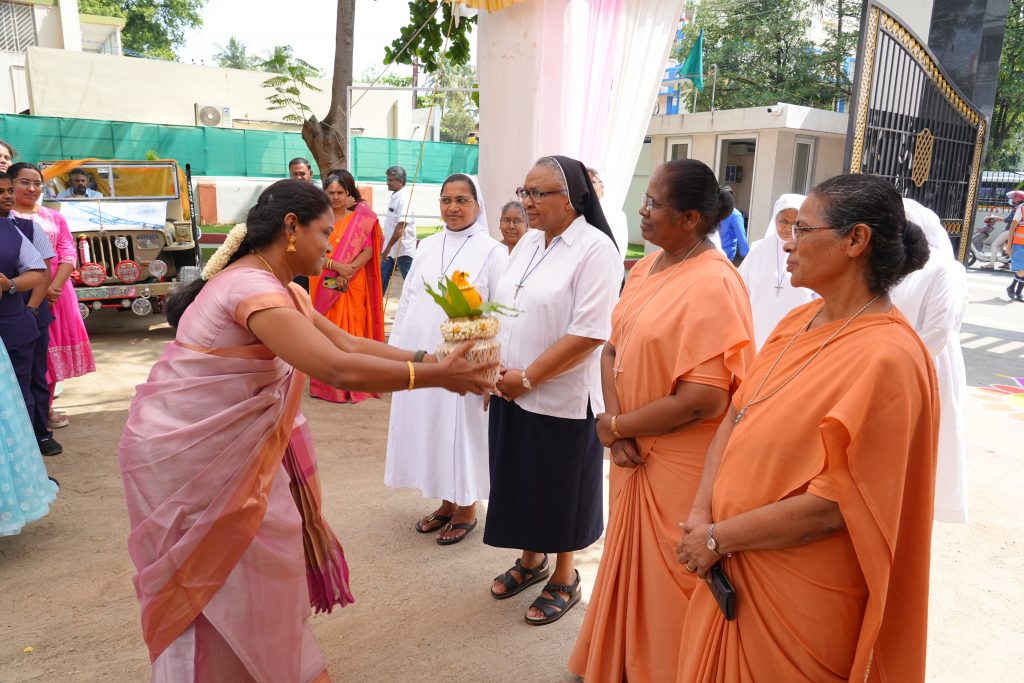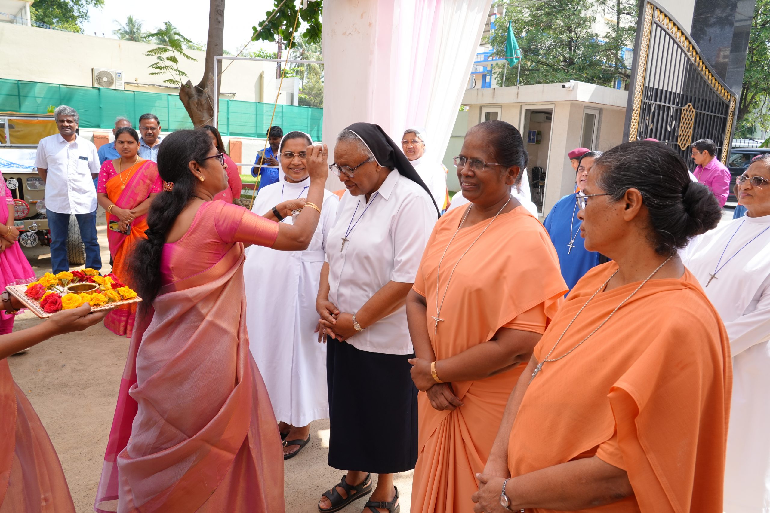 Mother General was ceremoniously escorted in a jeep from the back gate with a band procession. At the main entrance, she was given a traditional welcome with Kumba Arathi, Chandan, and Kumkum.