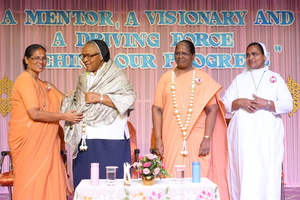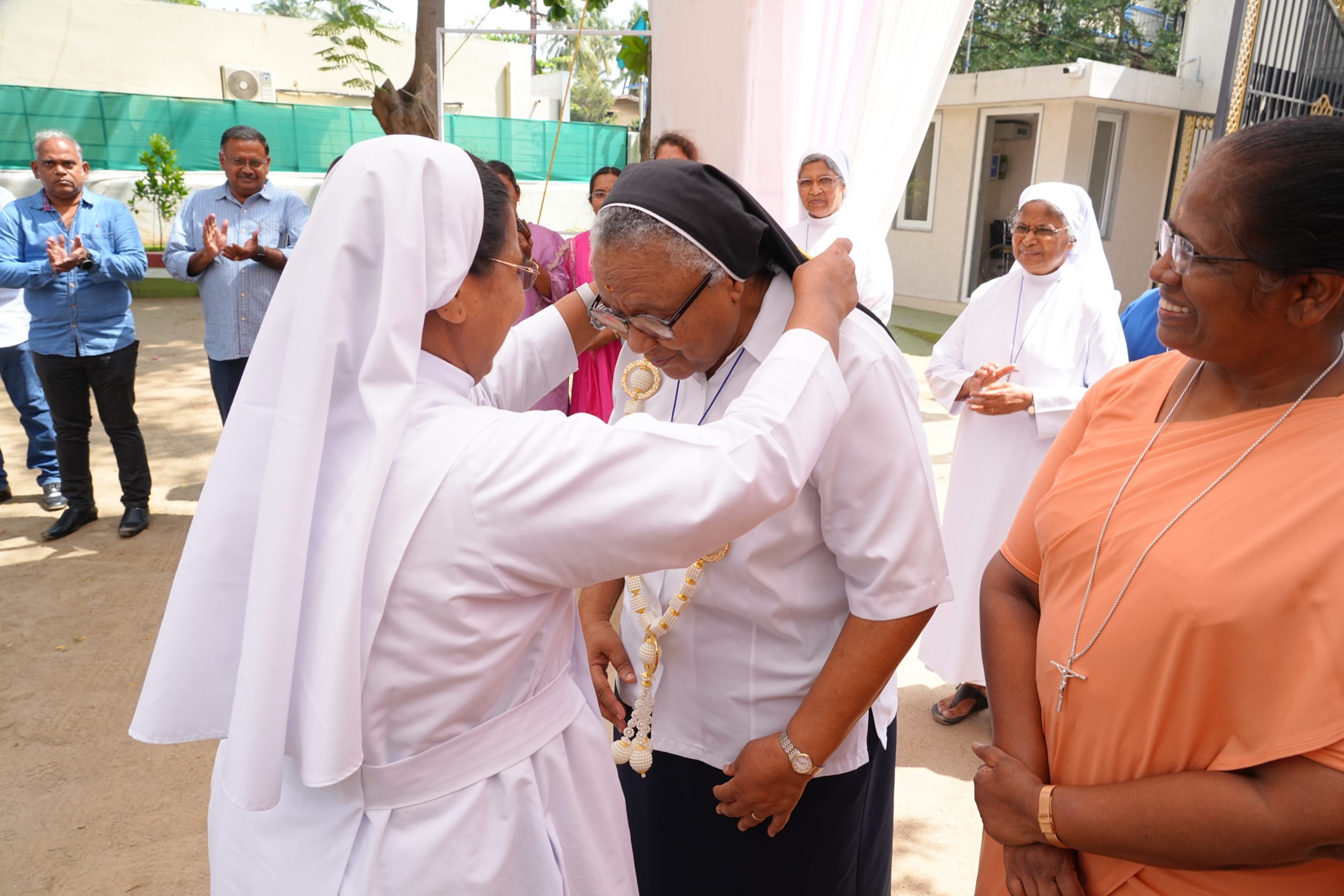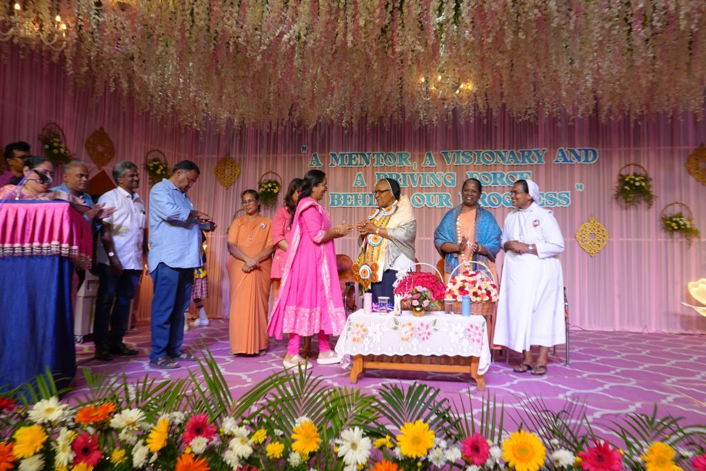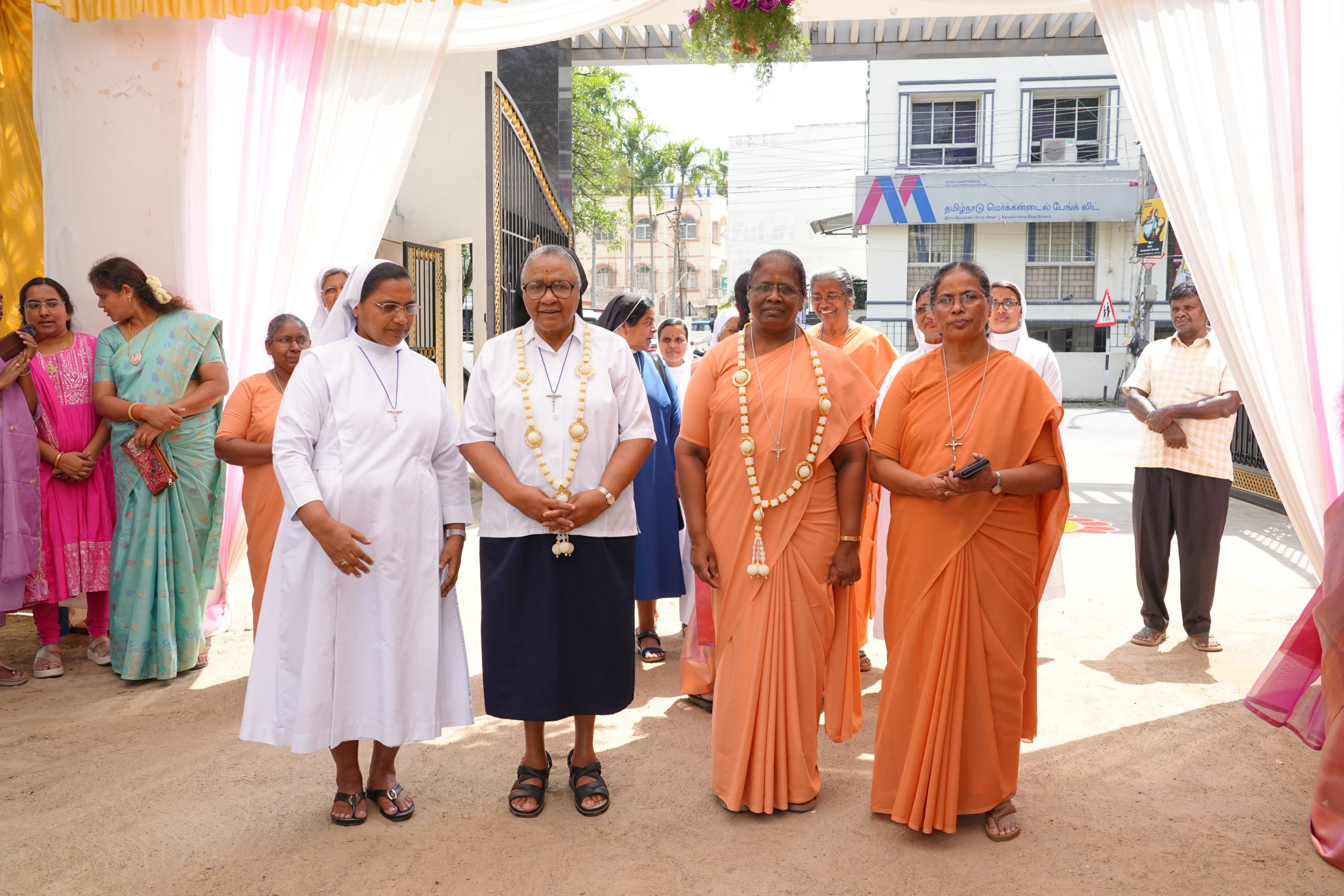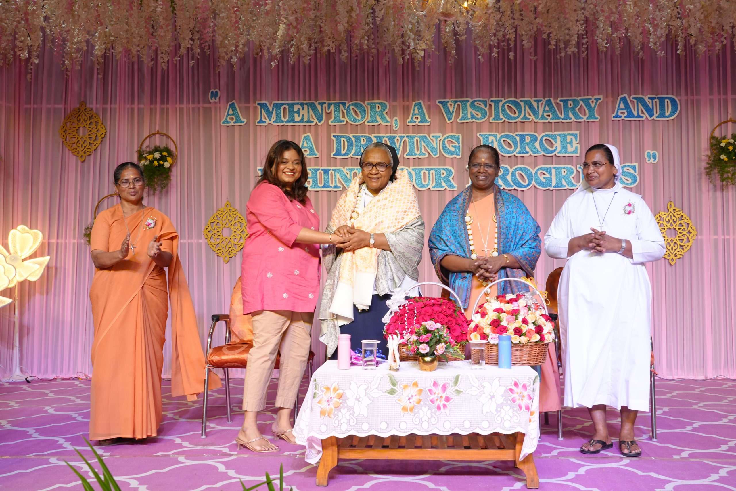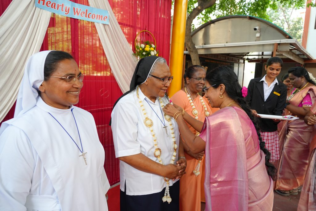 Mother General was ceremoniously escorted in a jeep from the back gate with a band procession. At the main entrance, she was given a traditional welcome with Kumba Arathi, Chandan, and Kumkum.